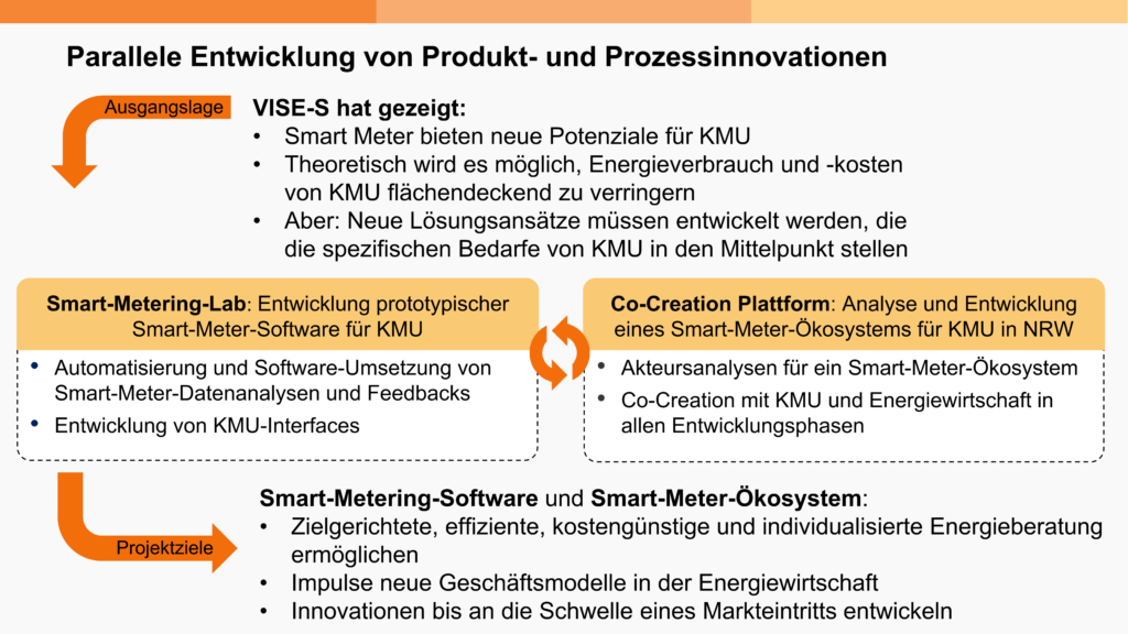 Sowohl die Entwicklung der Smart-Meter-Software als auch die Untersuchung eines Smart-Meter-Ökosystems sollen dazu beitragen, dass möglichst vielen KMU in Nordrhein-Westfalen eine zielgerichtete, effiziente, kostengünstige und individualisierte Energieberatung ermöglicht werden kann. Diese soll skalierbar und digitale möglich sein und somit möglichst viele KMU bei der Optimierung ihres Energieeinsatzes unterstützen.